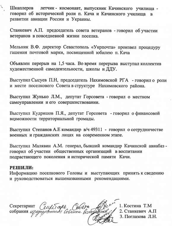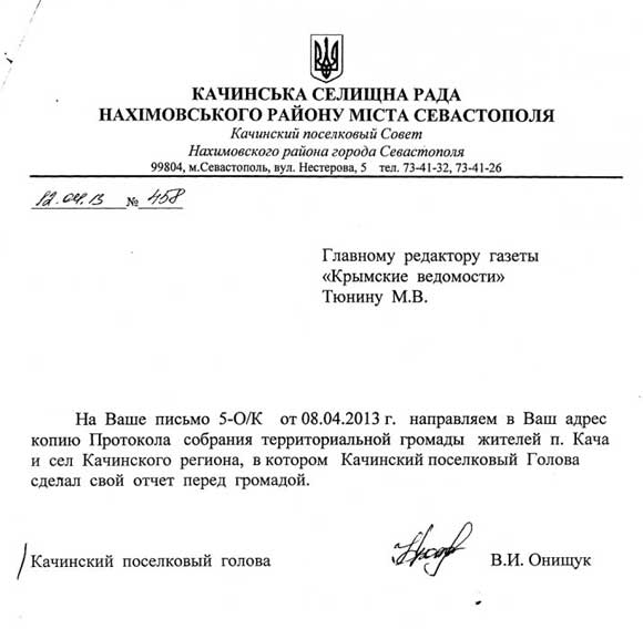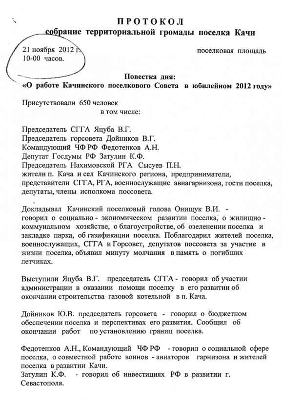 Письмом от 12.04.2013 (исх. № 458) Качинским поселковым Советом за подписью должностного лица, предположительно Кроки Д. Т. был предоставлен некий протокол собрания территориальной громады жителей п. Кача и сел Качинского региона от 21.11.2012, в котором Качинский поселковый голова якобы сделал отчет. (см. прил.).