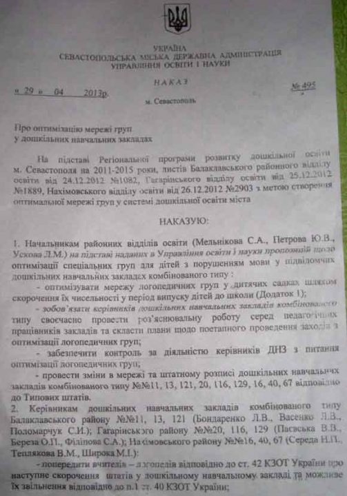 Причины этой «оптимизации» не понятны. Заведующие детскими садами передали копию приказа №495 от 29.04.2013 года в общественную организацию с просьбой провести правовую экспертизу этого документа.