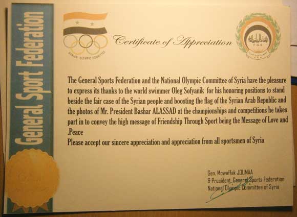 В грамоте, подписанной президентом Генеральной Федерации спорта Национального олимпийского комитете Сирии генералом Морафаком Джумаа, выражается благодарность Олегу Софянику за гражданскую позицию по поддержке справедливого дела сирийского народа.