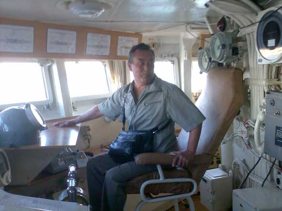 В боевой рубке множество приборов, аппарат, похожий по фильмам на перископ подводной лодки, с правой стороны, перед бронированными стеклами, - кресло. Догадываюсь, что это кресло командира. Тут же лежит большой морской бинокль. В рубке - два офицера. Они занимаются своими служебными делами, обращаясь, друг к другу не по званиям, а по имени и отчеству, переговариваются с корабельными постами по громкой связи. Атмосфера доброжелательная, но деловая. Спрашиваю, можно ли сесть, сделать снимок в командирском кресле, на боевом посту. Получив согласие, по очереди фотографируемся. Оглядываюсь и не вижу главного, без чего не может правильно двигаться корабль…- Штурвала! Спрашиваю у офицера: « … а где штурвал?». Он показывает на металлическую стойку, похожую на переносную трибуну, с уменьшенной копией автомобильного рулевого колеса и двумя крупными джостиками по краям. Я разочарован. Как можно управлять такой громадиной при помощи таких «игрушек»? Оказывается, можно.