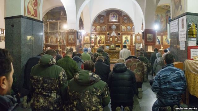 В комментариях немедля нашелся очевидец событий годичной давности, опубликовавший фотографию, сделанную в храме Андрея Первозванного. По его словам, «историческое фото» было сделано 1 марта 2014 года. На фотографии – коленопреклоненные люди в военной форме российских войск. Те самые, которых, по словам не бросающего своих солдат президента России Путина, в Крыму не было.