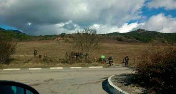 Как стало известно, военные вооружены автоматами, они в бронежилетах и касках. За деревьями спрятаны не менее шести грузовых военных автомобилей.