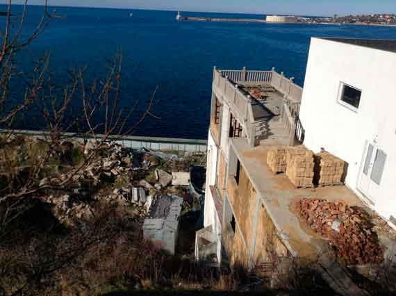 Одной из причин разрыва фундамента могут быть построенные здесь апартаменты «голубые унитазы», как их называют сами севастопольцы: во время строительства гостиничного комплекса на мысе Хрустальный была существенно повреждена лестница, ведущая к обелиску, угрожая его обрушением, серьезно просела смотровая площадка. Непосредственно под площадкой со стелой до сих пор продолжаются строительные работы — мыс все еще влечет застройщиков различных мастей. «Примечания» стали свидетелем строительных работ.
