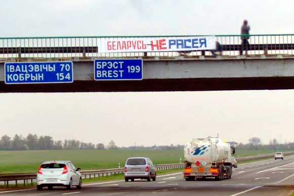 С этой целью активисты проехались по трассе Е30 между Минском и Брестом незадолго до того, как по ней должна была направляться к западной границе мотоколонна "Ночных волков". Сразу несколько мостов, под которыми должны были проезжать "путинские байкеры", украсили оперативно сделанными растяжками с надписями "Беларусь - не Расея", "Свою землю мы никому не отдадим" и "Нет фашизму! И российскому тоже! Путинцы, убирайтесь домой".