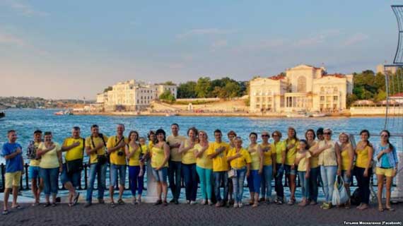 В центре Севастополя, неподалеку от пляжа «Хрустальный», 27 жителей города сфотографировались в желто-голубых одеждах – так местные патриоты поздравили Украину с Днем национального флага, сообщает корреспондент Крым.Реалии.