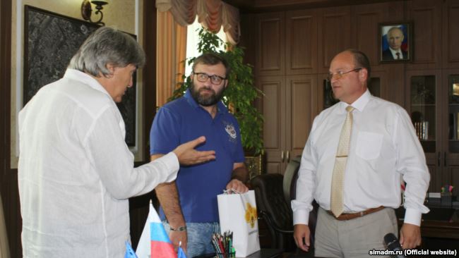 Режиссер Виталий Павлов, актер Михаил Пореченков и экс-глава российской администрации Симферополя Геннадий Бахарев обсуждают перспективы развития киноиндустрии в Симферополе, 7 сентября 2015 года