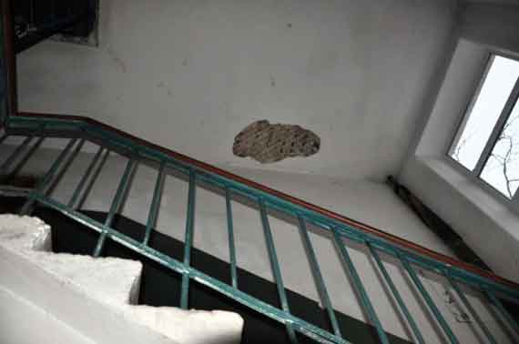 Продолжив экскурсию по подъезду, Ирина обратила внимание журналистов на потолок второго этажа, с отсутствующим куском штукатурки и проглядывающим куском потолочной дранки. Признаться, сия картина явно диссонировала с новенькой наружной отделкой здания. Тем более, что вокруг прорехи явно просматриваются ржавые водяные разводы.