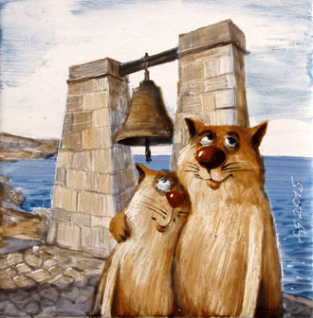 Когда Анатолий сделал несколько котов, завязалась эта нескончаемая серия. Коты в глине и на картинах зажили своей жизнью. Есть среди них мореманы в тельняшках и с удочками, есть одинокие и непонятые, разъевшиеся торговцы, есть (нечего греха таить) обременённые не самыми полезными привычками. Коты-ловеласы дефилируют по набережной, коты-пляжники загорают в шезлонгах и на подстилках, коты-туристы, поправляя рюкзаки, осматривают вид с горы… В богатой «котоистории» есть даже самый настоящий севастопольский Диоген, только вместо классической бочки он приспособил под жильё склеенную амфору.