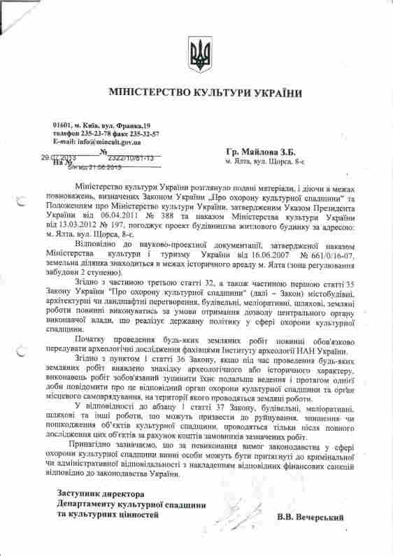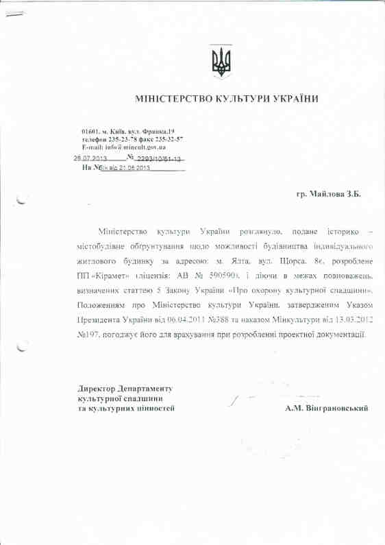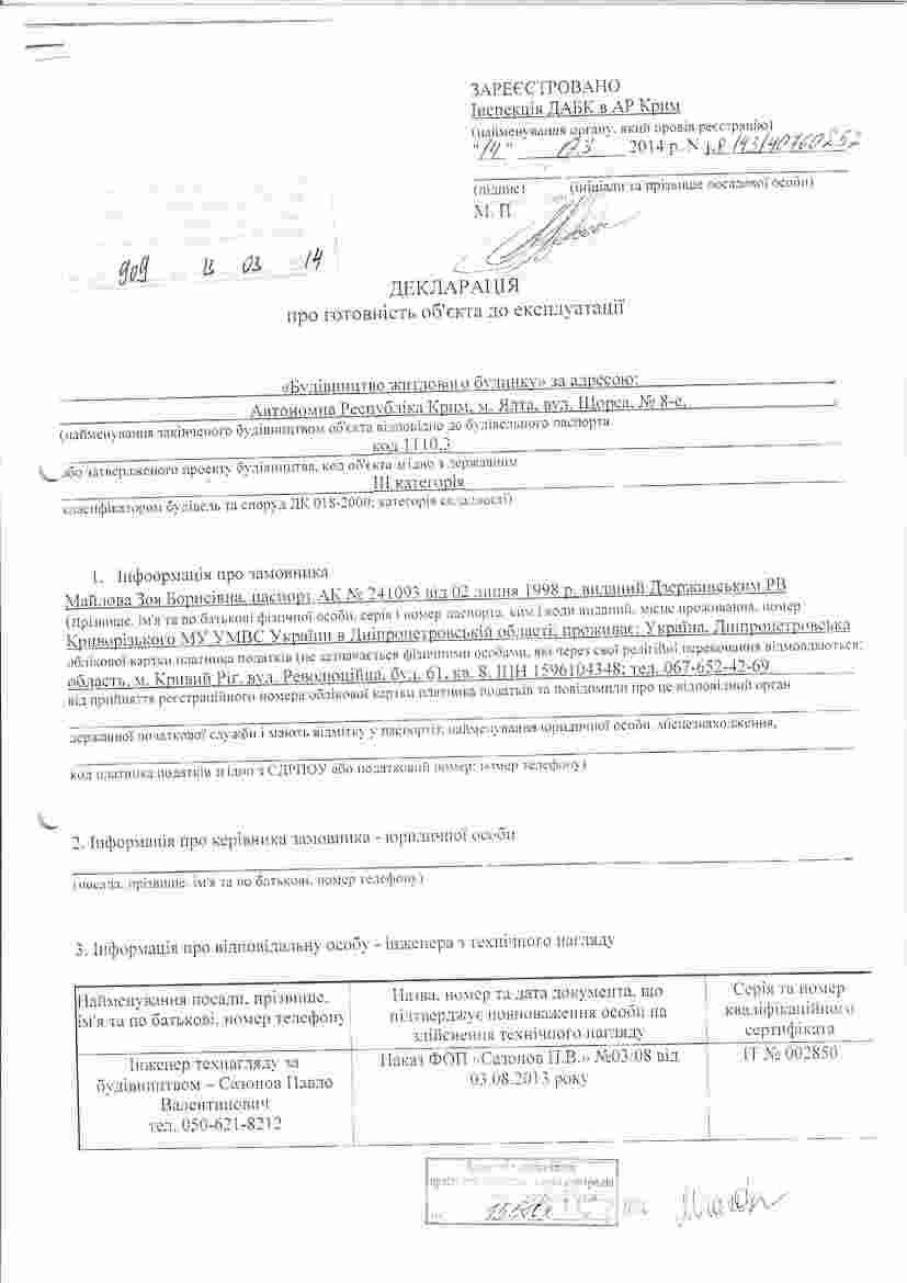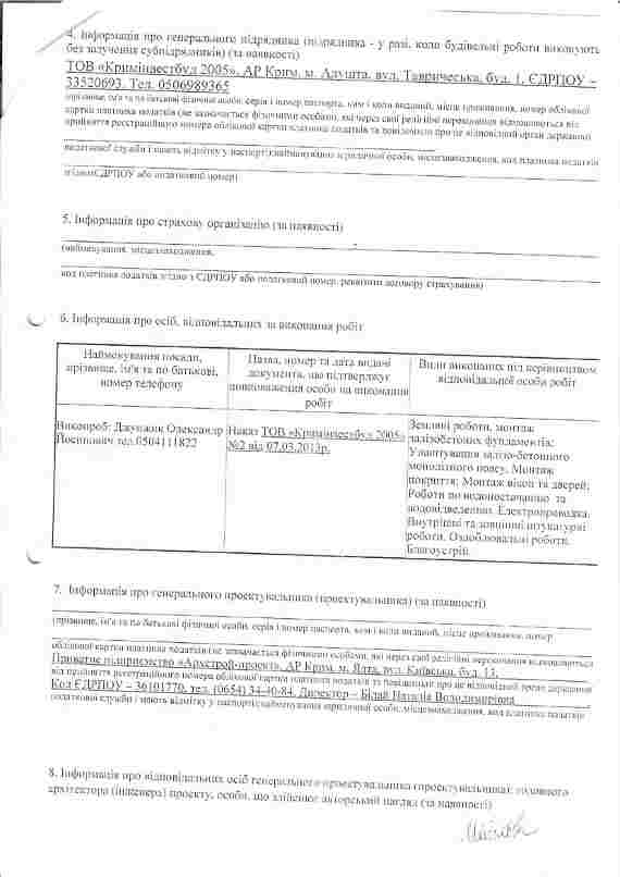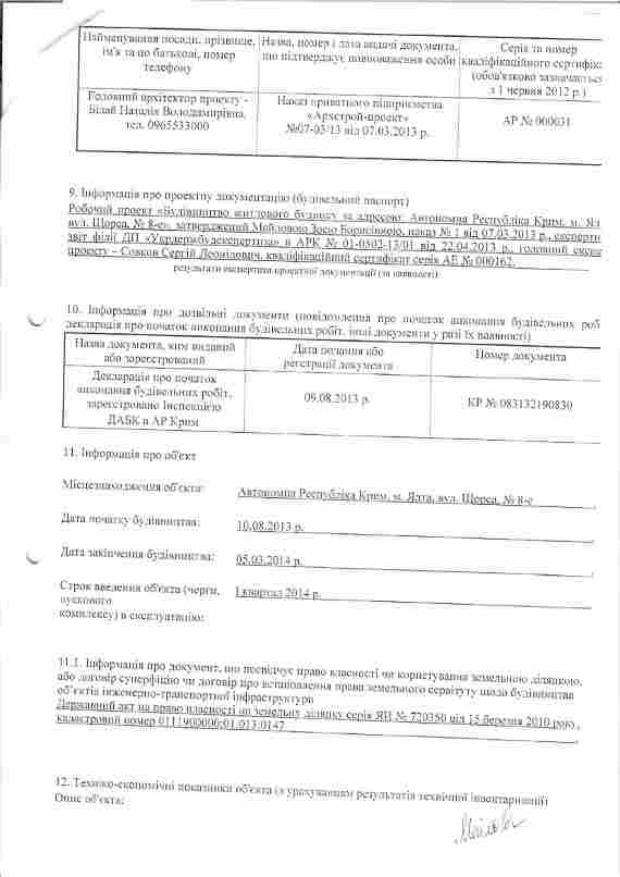 В 2013 году застройщиком были получены градостроительные условия и разработан рабочий проект, который прошел госэкспертизу, получено декларация на начало строительных работ и на основании этих документов был построен этот дом. Позже была получена декларация на окончания строительных работ и дом был сдан в эксплуатацию. А в 2014 году Ялтинским судом было установлено, что дом не является самовольной постройкой не нарушает права третьих лиц, а также не несет угрозы жизни и здоровью людей (решение вступило законную силу ).