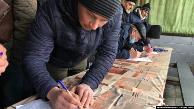 Собравшиеся в Старом Крыму крымские татары подписывают коллективное заявление в правоохранительные органы из-за применения пыток к активисту Нариману Аметову. Об этом сообщили в гражданском объединении «Крымская солидарность».