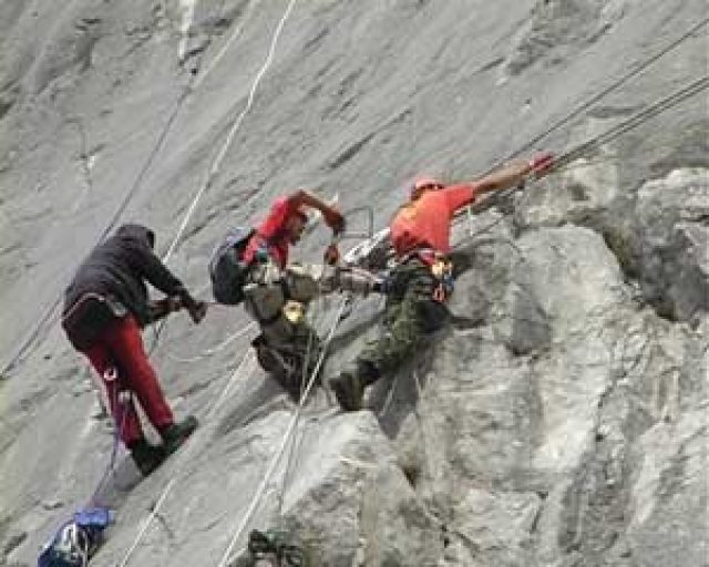 Скала Парус над Форосом второй раз собрала форум спасателей. В течение двух дней командам было предложено разработать тактику прохождения дистанции, подобрать необходимое снаряжение и произвести транспортировку условно пострадавшего с отвесной скалы. Было разрешено все, что используют спасатели в своей практике. Но настрого запрещены любые приемы, ставящие под сомнение безопасность участников команды.  Многолетняя практика спасательных работ в Крыму говорит о том, что время на транспортировку травмированного человека от места аварии до машины скорой помощи не должно превышать полтора часа. Исходя из этого, судьи ввели контрольное время на прохождение дистанции. По истечению этого времени судьи фиксировали на фотографии положение всех участников команд на скале. А потом довольно просто определялись места команд в протоколе результатов. Без мест не остался никто.