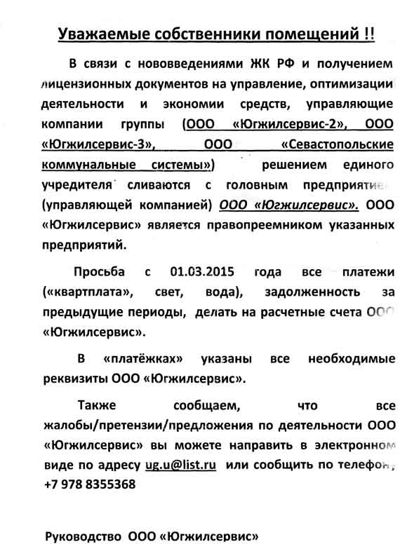 На наших домах все кому не лень лепят объявления о том, что они кто-то и есть наши УК. На днях на наших подъездах вновь появилось объявление, что у нас опять новая УК «Югжилсервис», которая возникла в результате реорганизации (слияния) из трех других (Югжилсервис-2, Югжилсервис-3, Коммунальные системы).